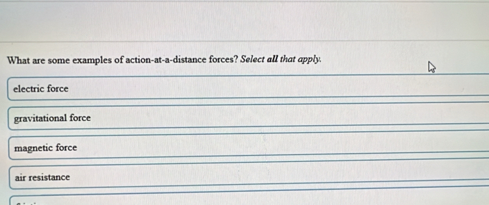 Solved: What are some examples of action-at-a-distance forces? Select ...