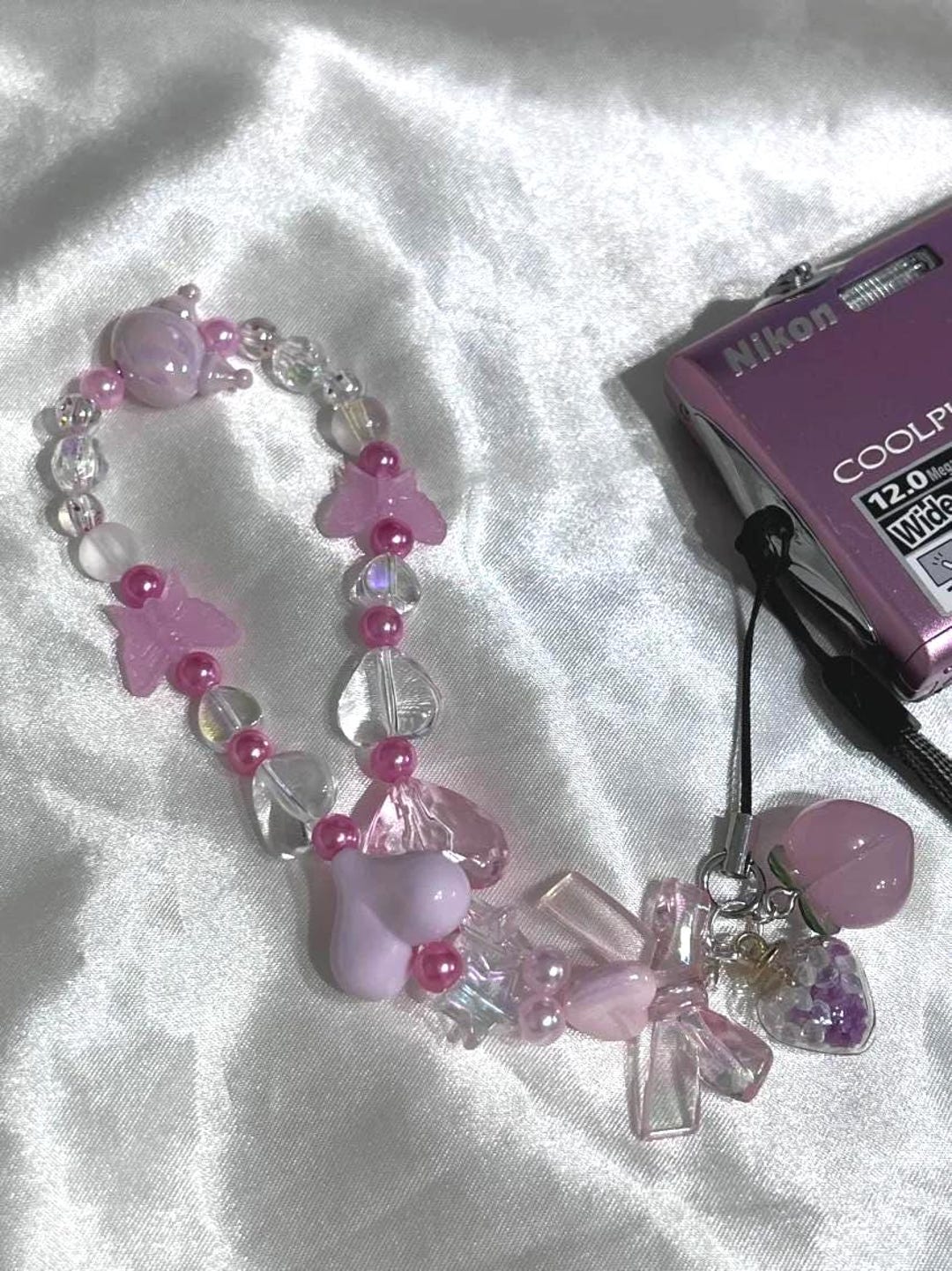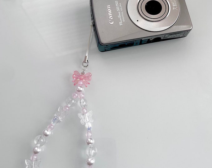 Pink Heart Butterfly Ribbon Kuromi Digicam Beaded Keychain Phone Charm ...