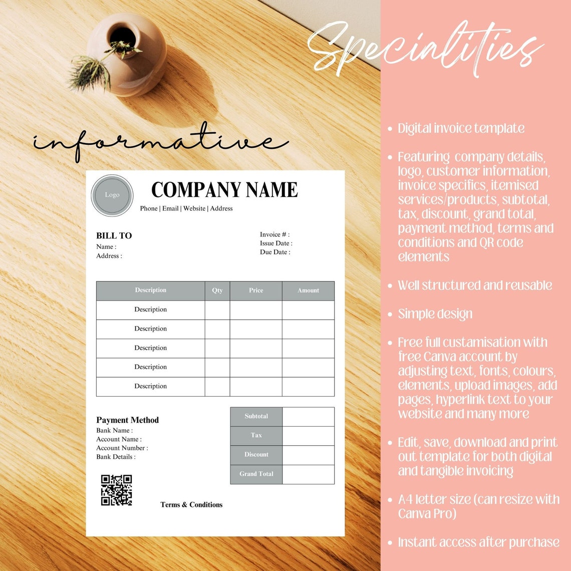 Basic Digital Invoice Canva Template With Logo, QR Code, Editable ...
