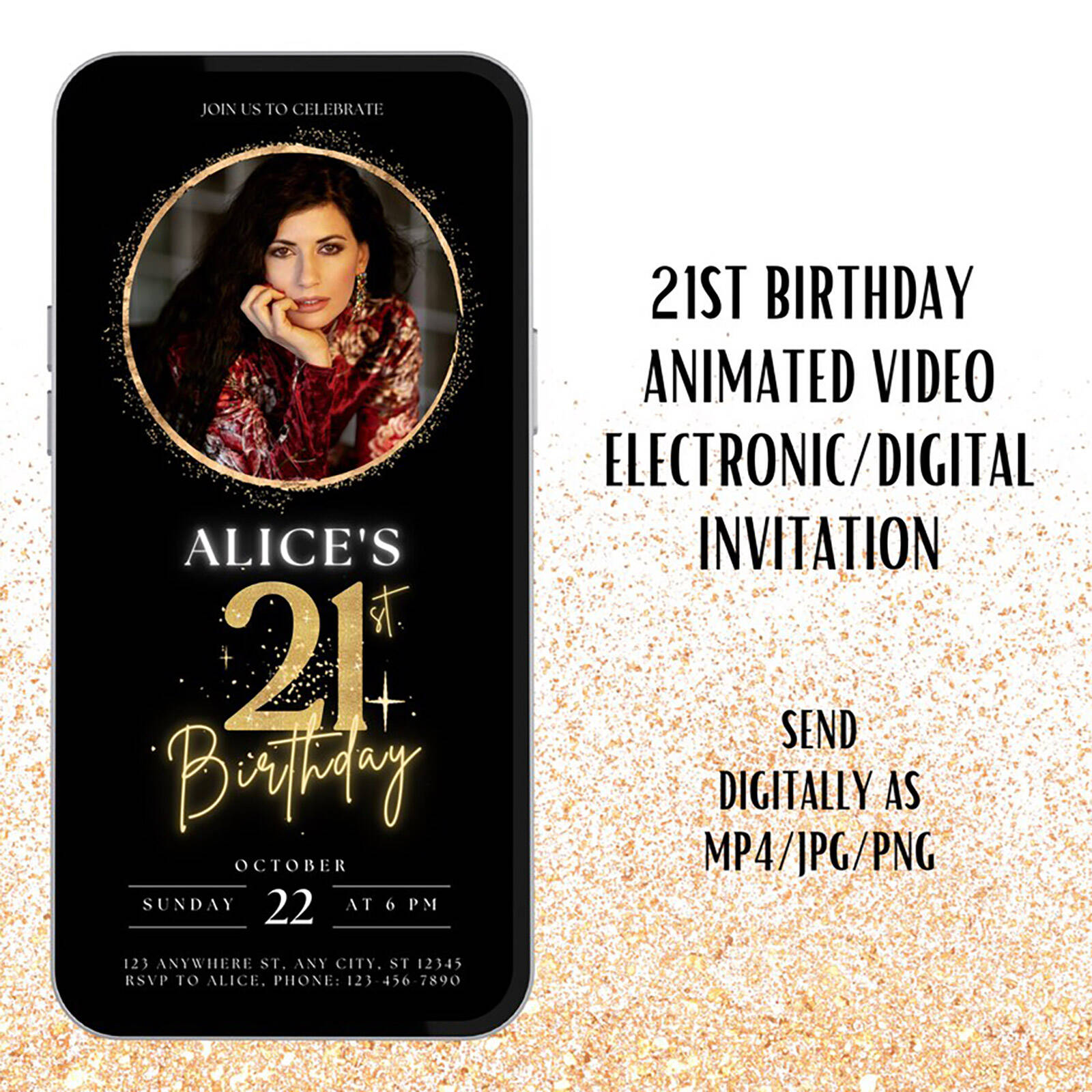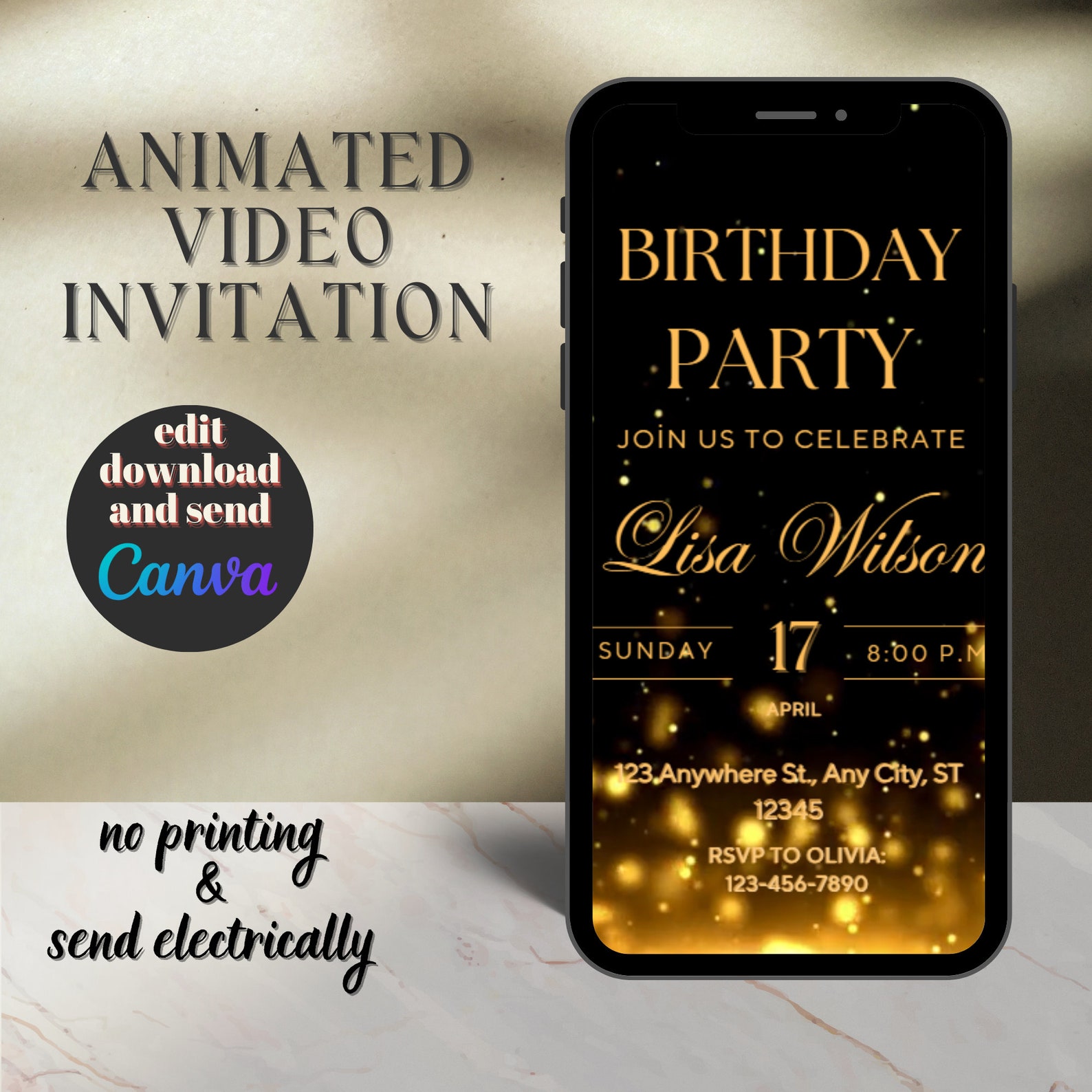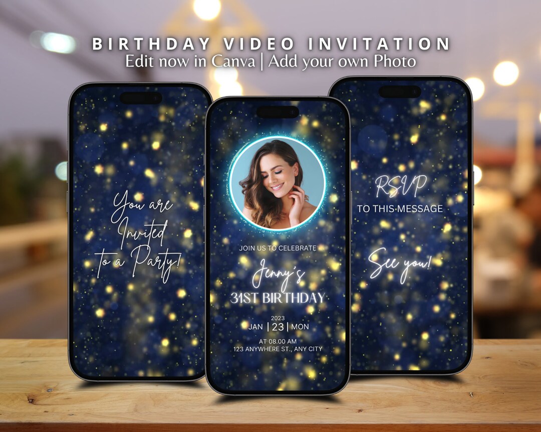 Digital Birthday Video Invitation, Gold Editable Invite, Personalized ...