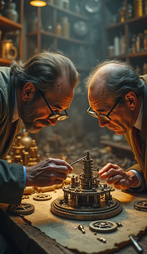Mid-20th-century scientists in a dim laboratory, magnifying glasses in ...