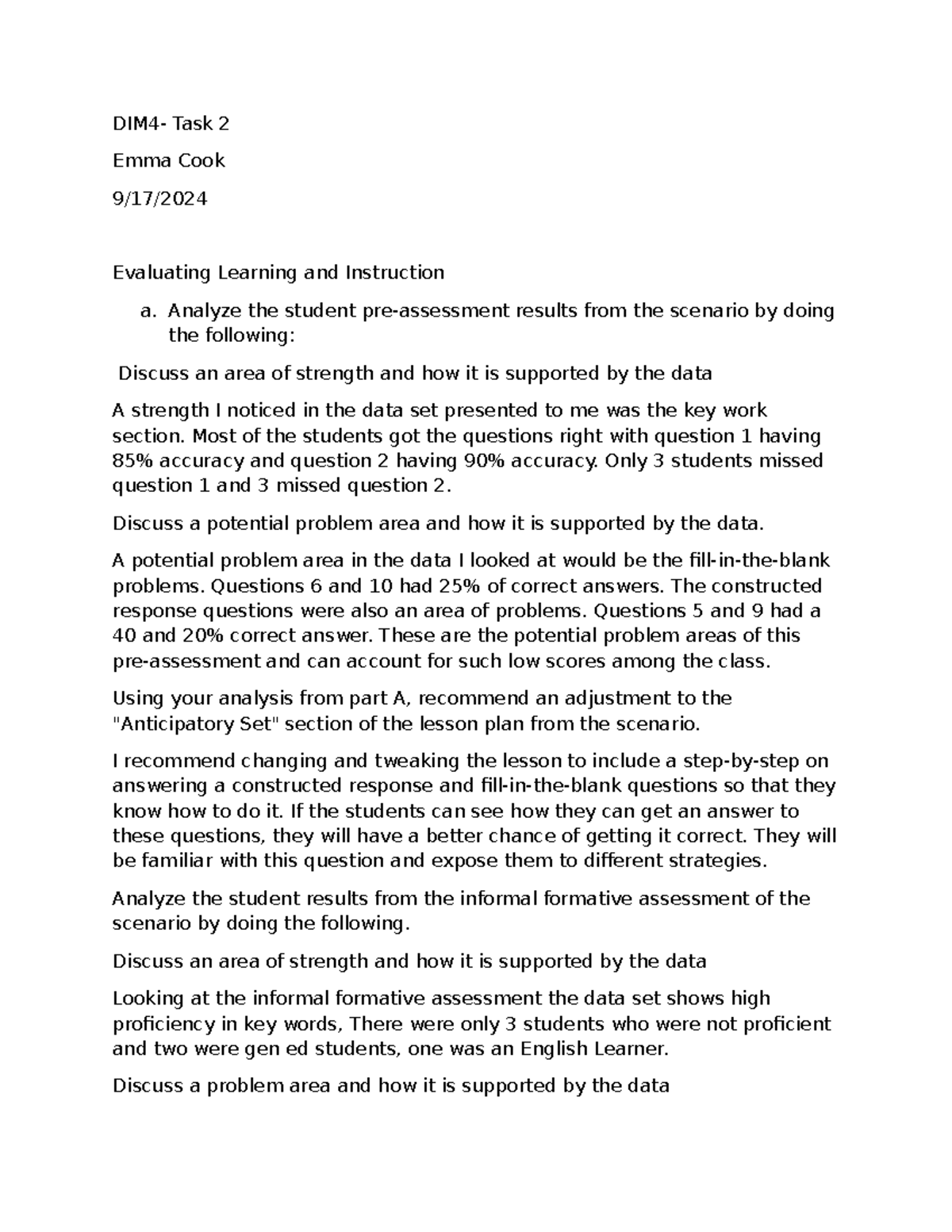 DIM4 TASK 2 - PASSED - DIM4 — DIM4 Task 2: Evaluating Learning and ...