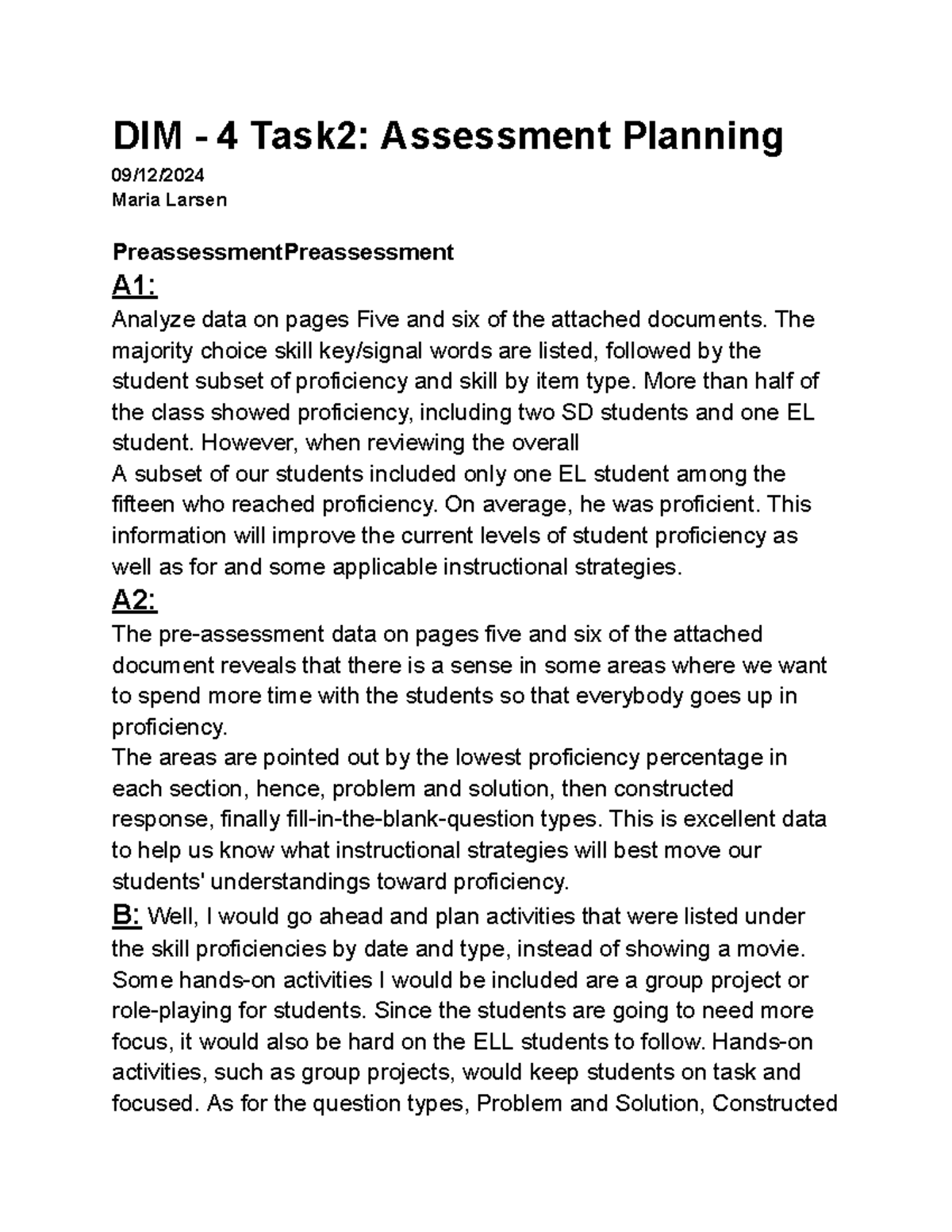 DIM 4 Task 2: Assessment Planning and Student Proficiency Analysis ...