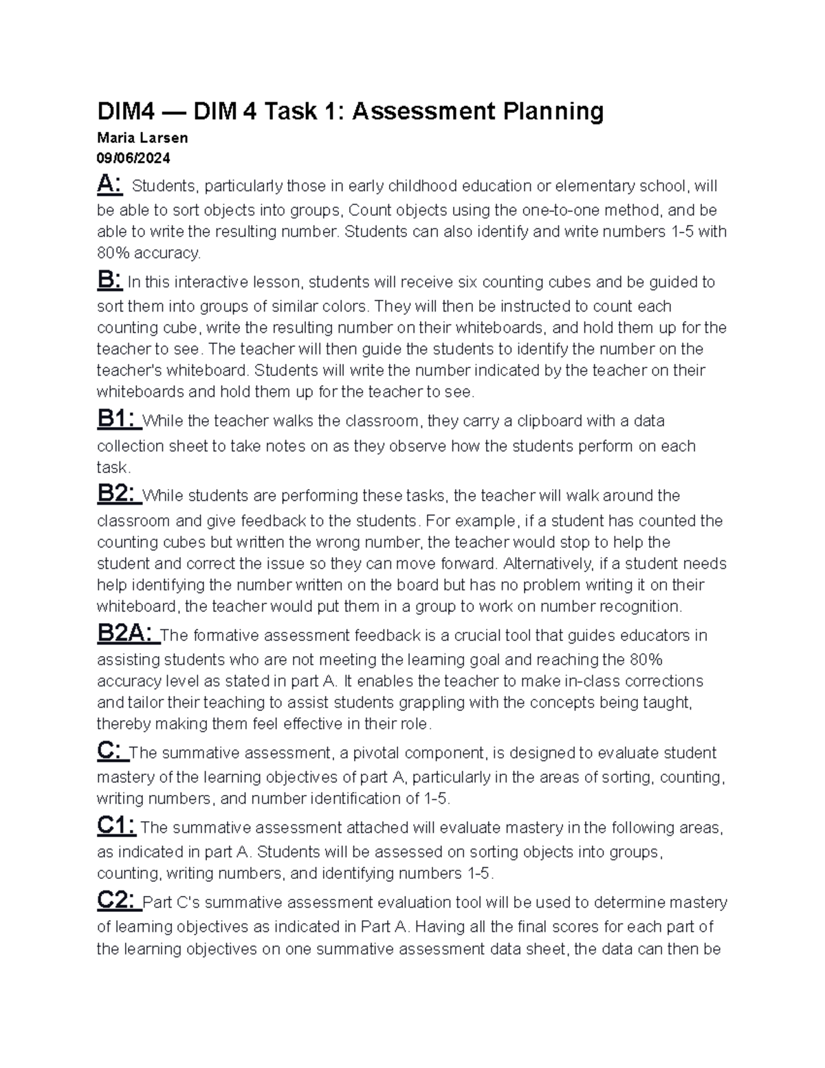 DIM 4 Task 1: Planning Assessment for Early Childhood Math Skills - Studocu