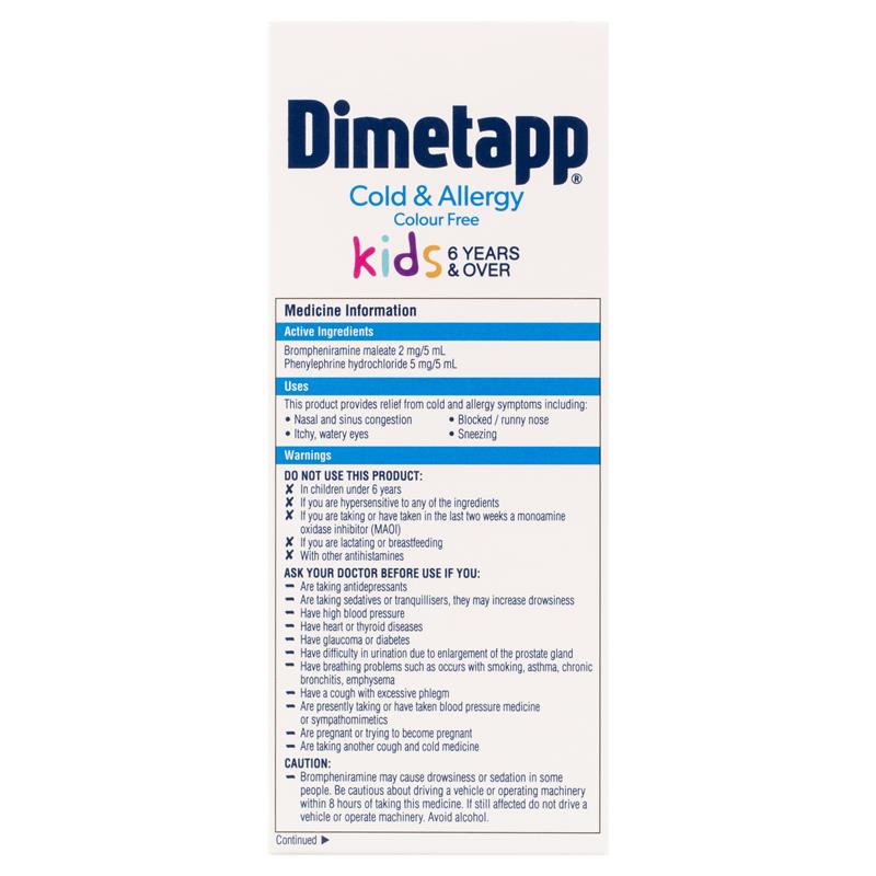 Buy Dimetapp Kids 6+ Years Cold & Allergy Elixir Colour Free & Sugar ...