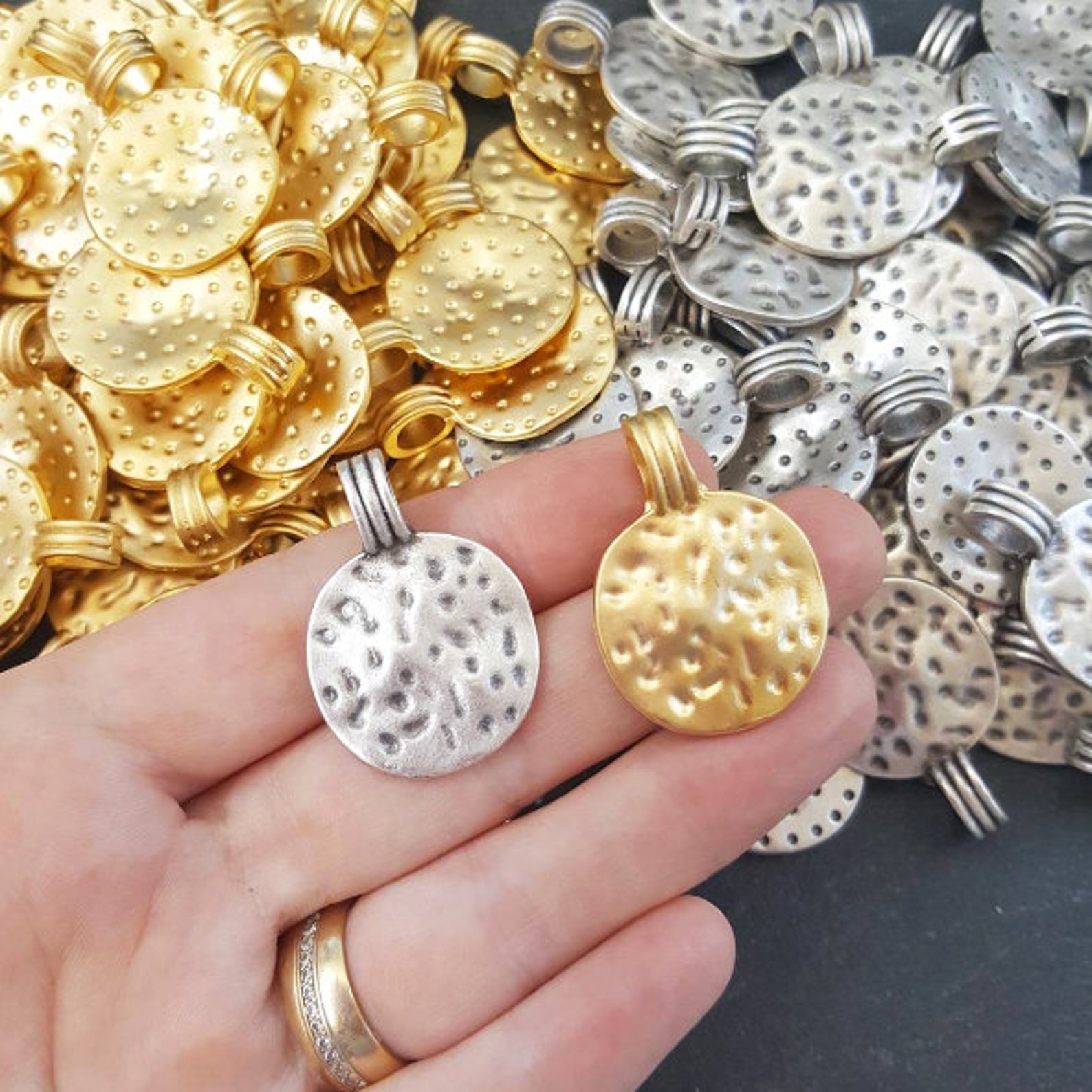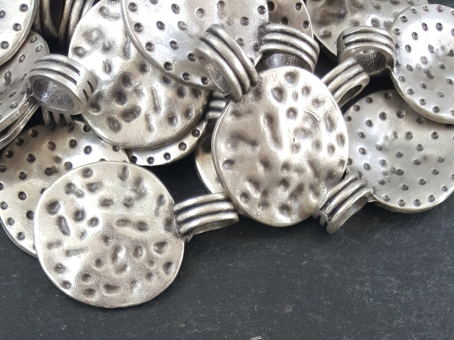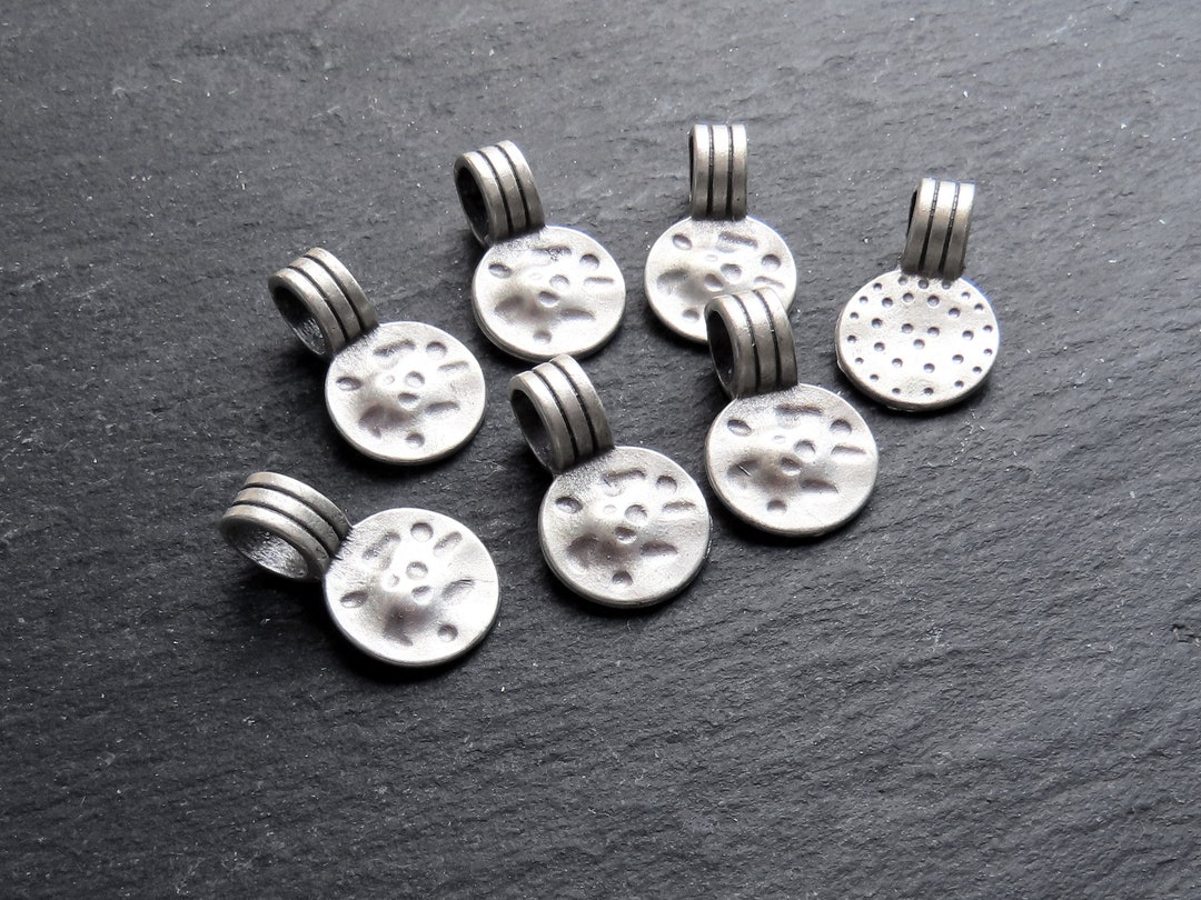 Hammered Dimple Disc Drop Charms, Wide Hole Bail Pendant, Antique Matte ...