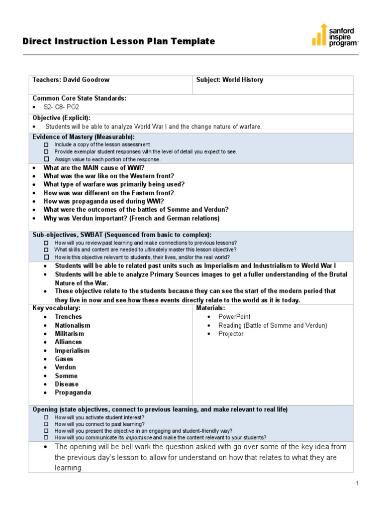 Direct Instruction Lesson Plan Template Wwi | PDF | Educational ...