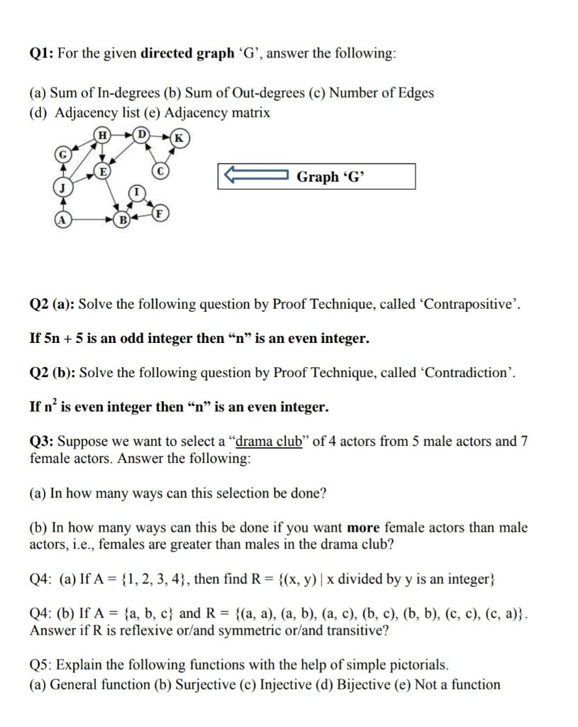 Solved Q1: For the given directed graph ' G ', answer the | Chegg.com