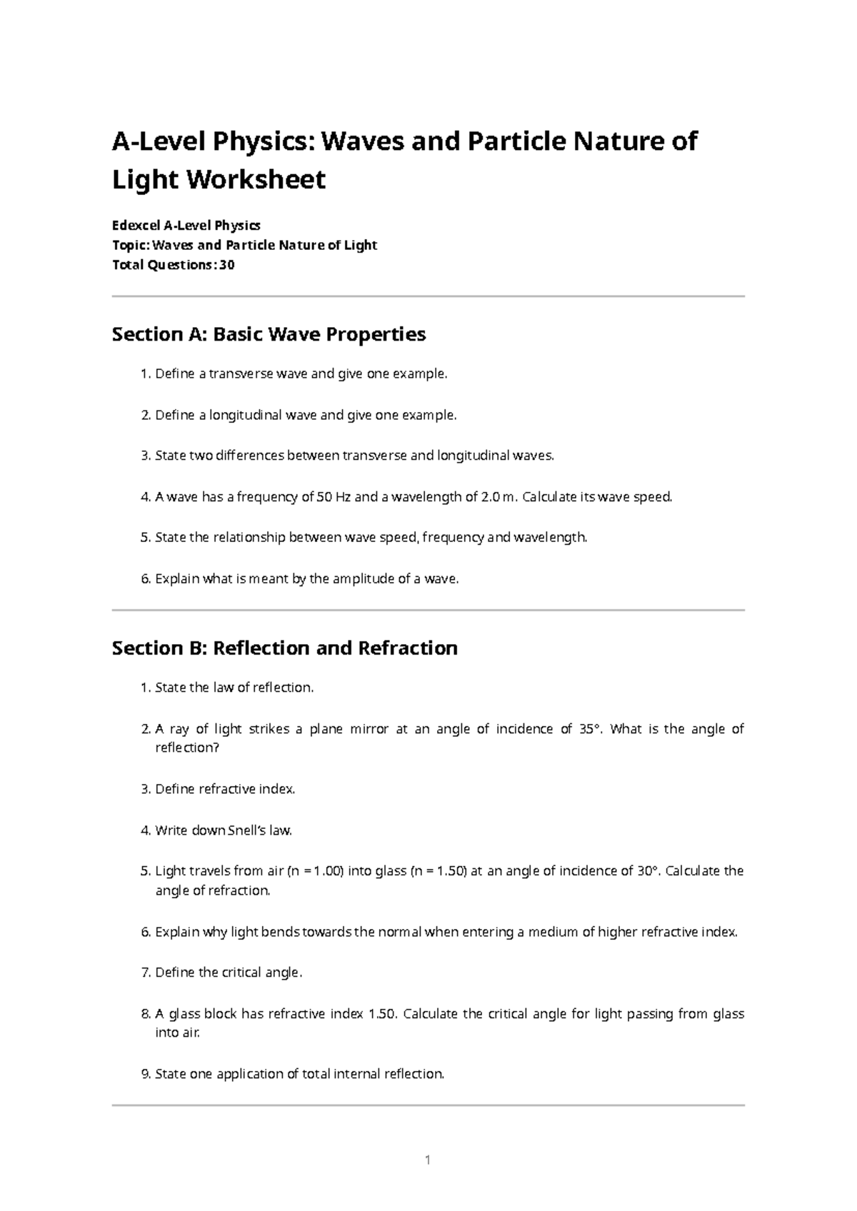 A-level Physics: Waves & Particle Nature of Light Worksheet - Studocu