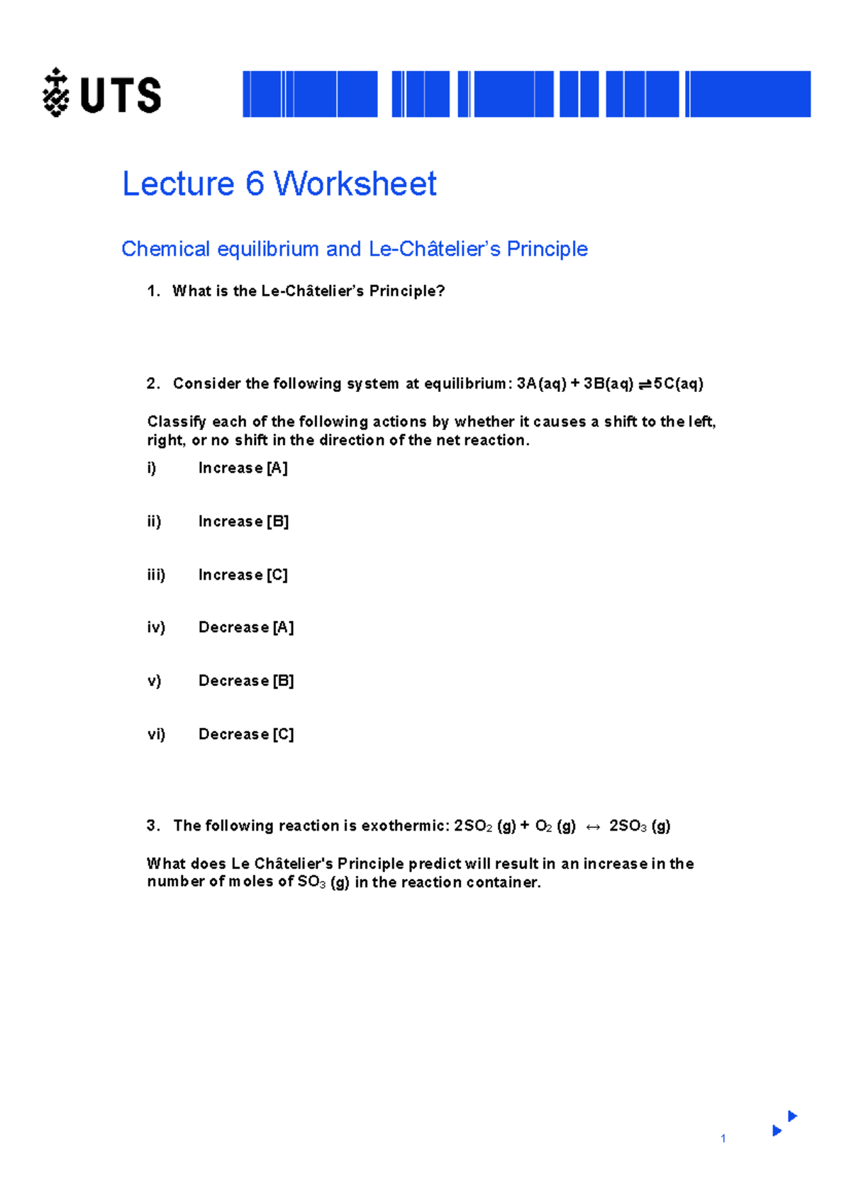 Lecture 6 Worksheet: Chemical Equilibrium & Acid-Base Concepts - Studocu