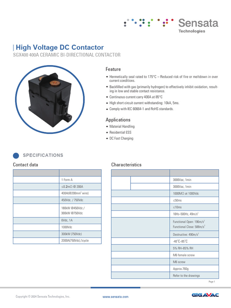 SGX400 High Voltage Contactor Specs | PDF | Insulator (Electricity ...