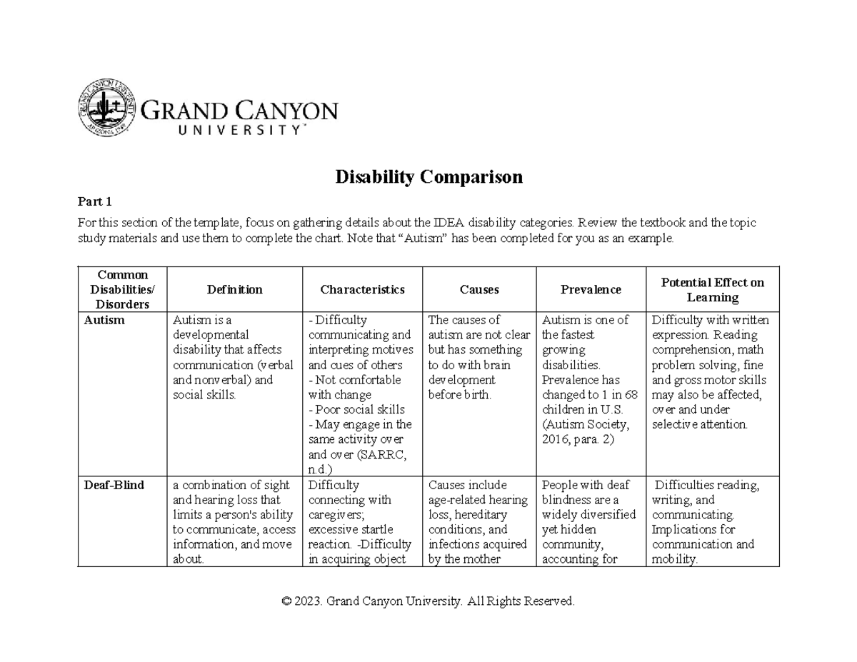 Solved Disability Comparison Template Part 1: For this | Chegg.com