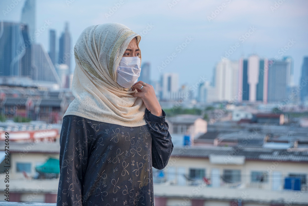 Islamic woman wearing hijab and coughing because the air is dusty, the ...