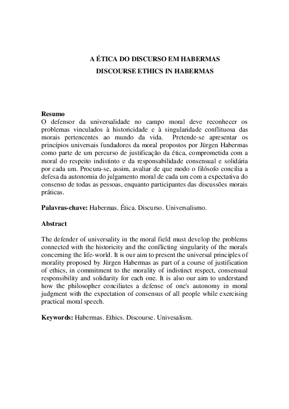 (DOC) A ÉTICA DO DISCURSO EM HABERMAS DISCOURSE ETHICS IN HABERMAS
