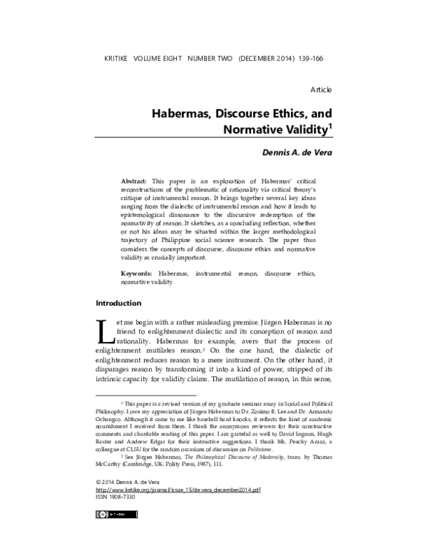 (PDF) Habermas, Discourse Ethics, and Normative Validity