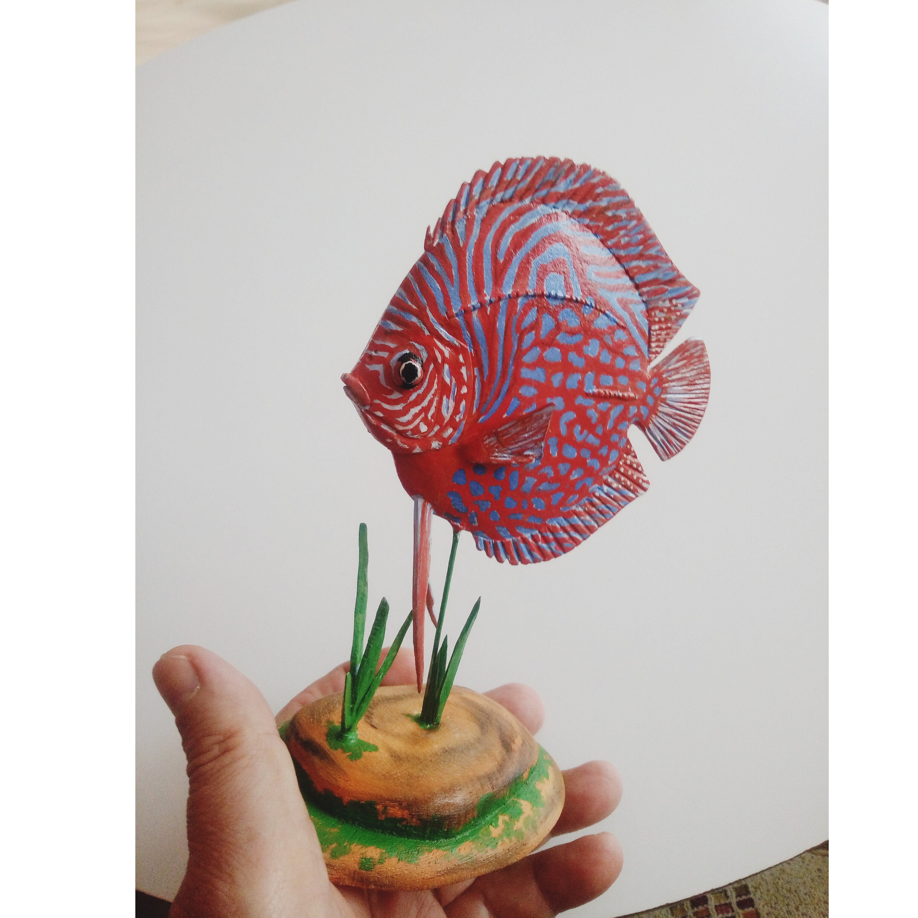 Wooden Hand-carved Blue-red Discus Fish. Wooden Carved Fish. Hand ...