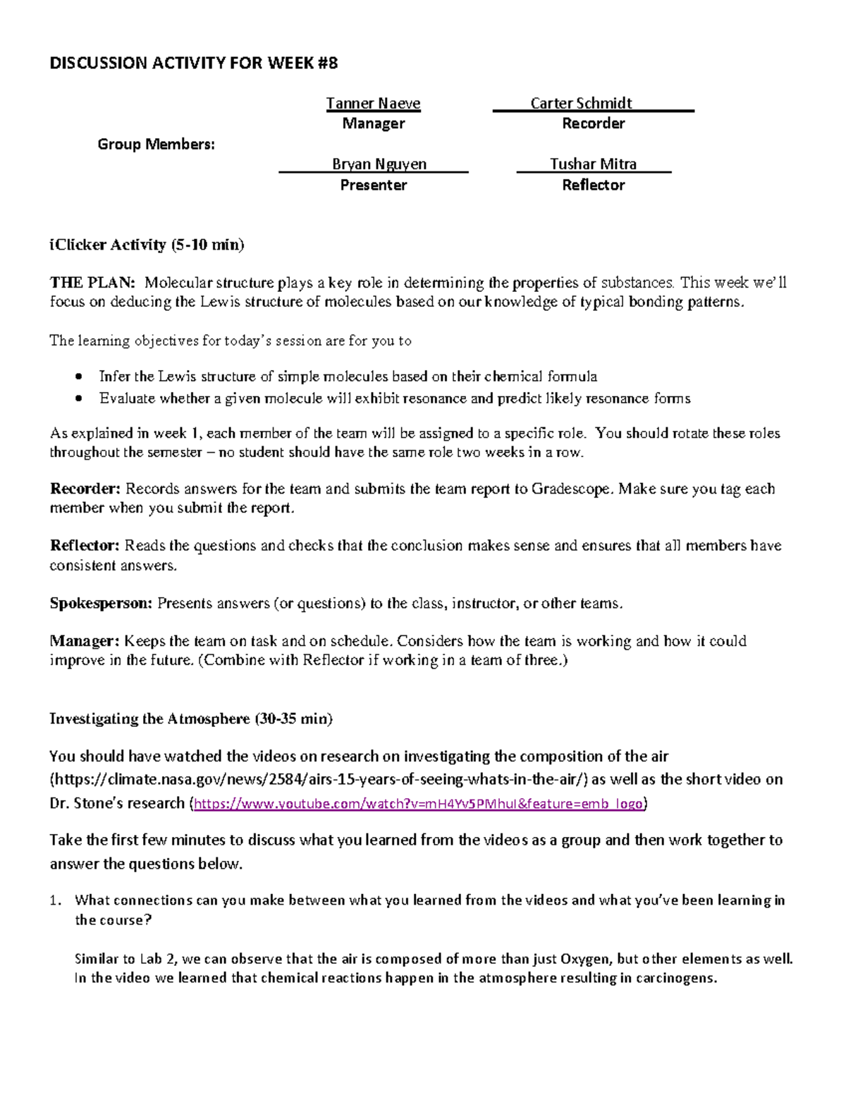 Discussion Worksheet Week 8 - DISCUSSION ACTIVITY FOR WEEK Group ...