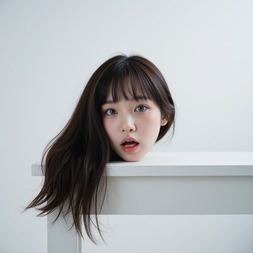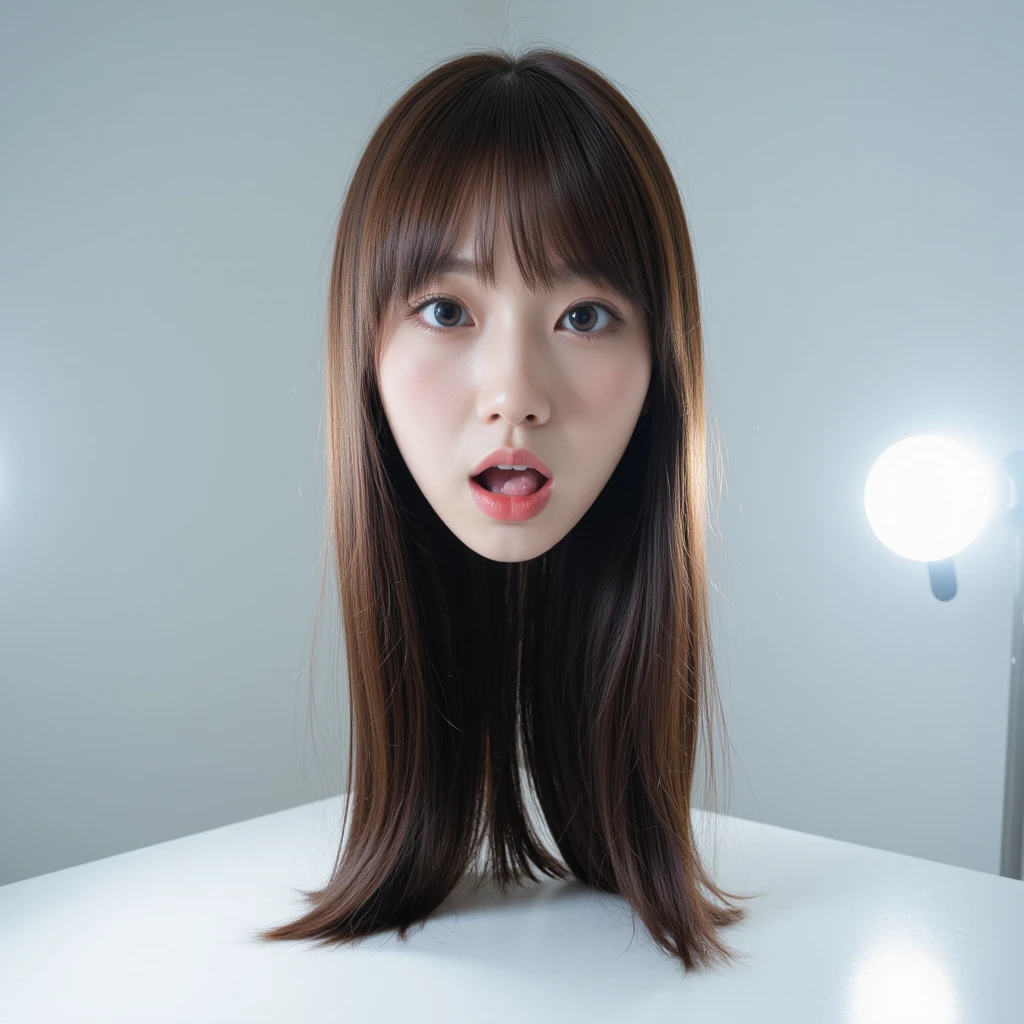 A beautiful, young, chinese girl's disembodied head stands on a white ...