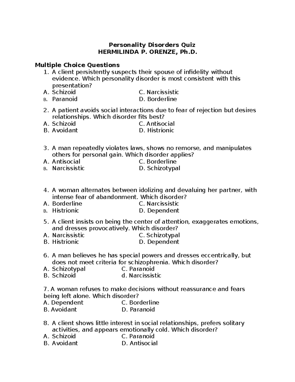 CRIM 3 Final Quiz on Personality Disorders - Studocu