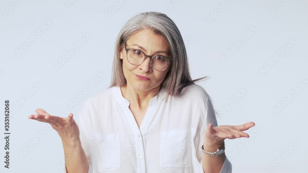 A confused disappointed old mature woman with long gray hair wearing ...