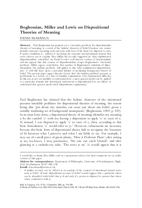 (PDF) Boghossian, Miller and Lewis on Dispositional Theories of Meaning