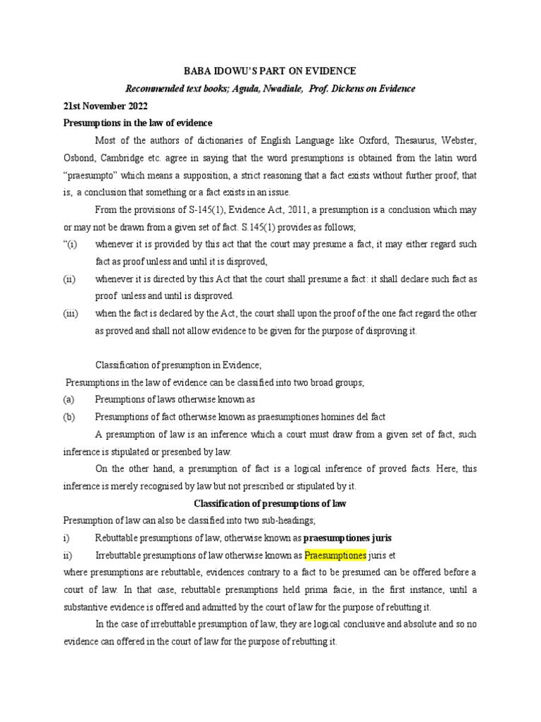 Presumption: Law of Evidence II | PDF | Evidence (Law) | Burden Of ...
