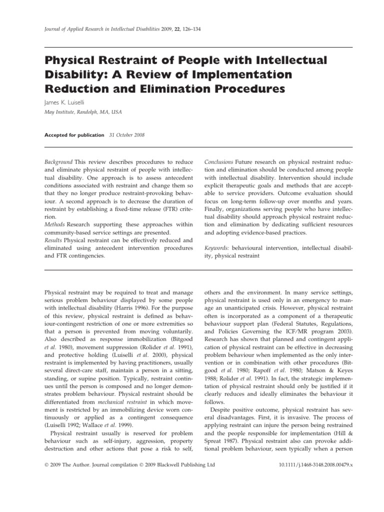 Research Intellect Disabil - 2009 - Luiselli - Physical Restraint of ...