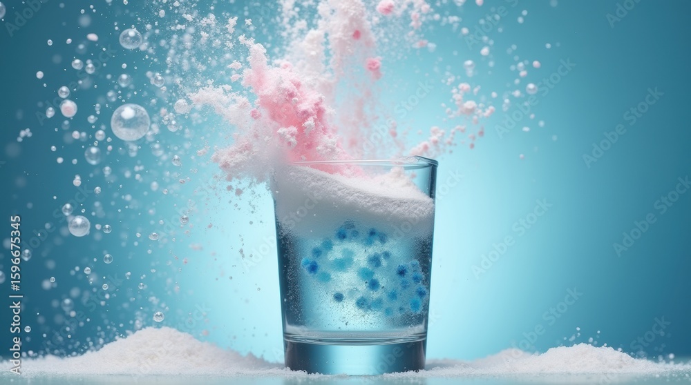 Macro shot of washing powder dissolving in water, creating an eruption ...