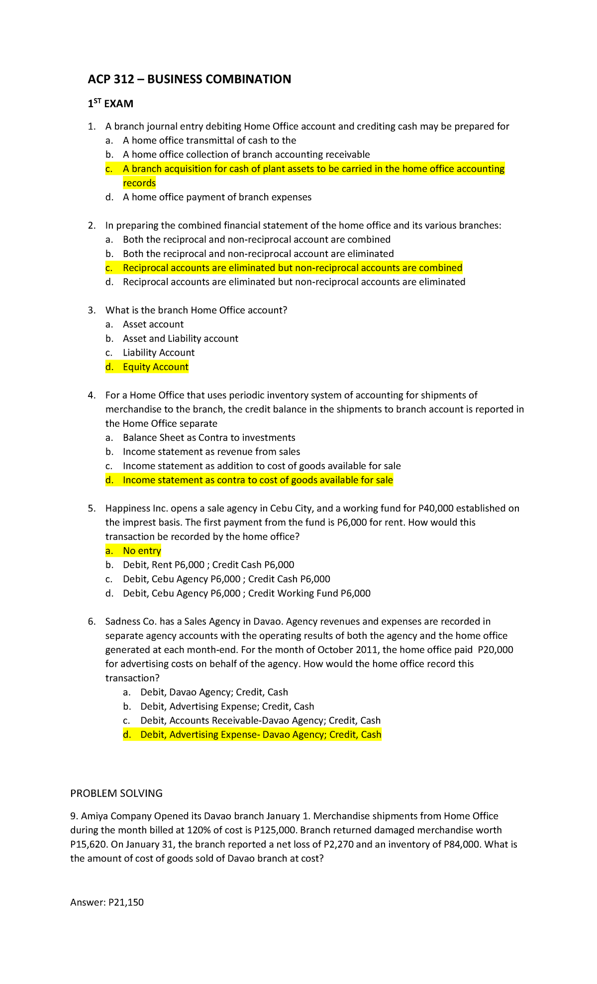 ACP 312 BUSINESS COMBINATION 1ST EXAM REVIEW NOTES - Studocu