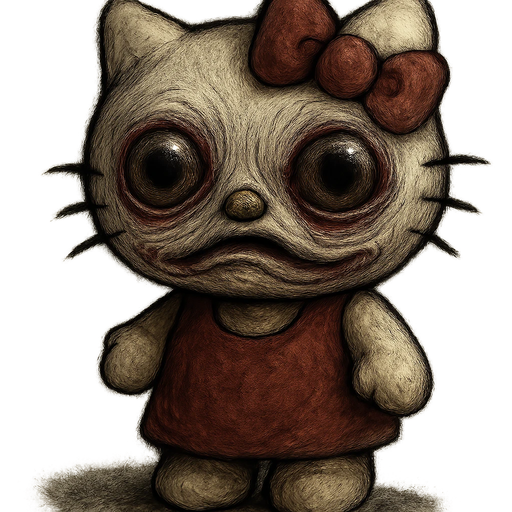 uncanny Hello Kitty with distorted face and unusual eyes, unsettling ...