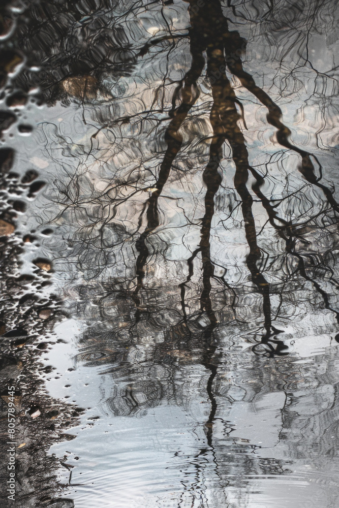Distorted reflections of trees in a rainwater puddle, with their ...