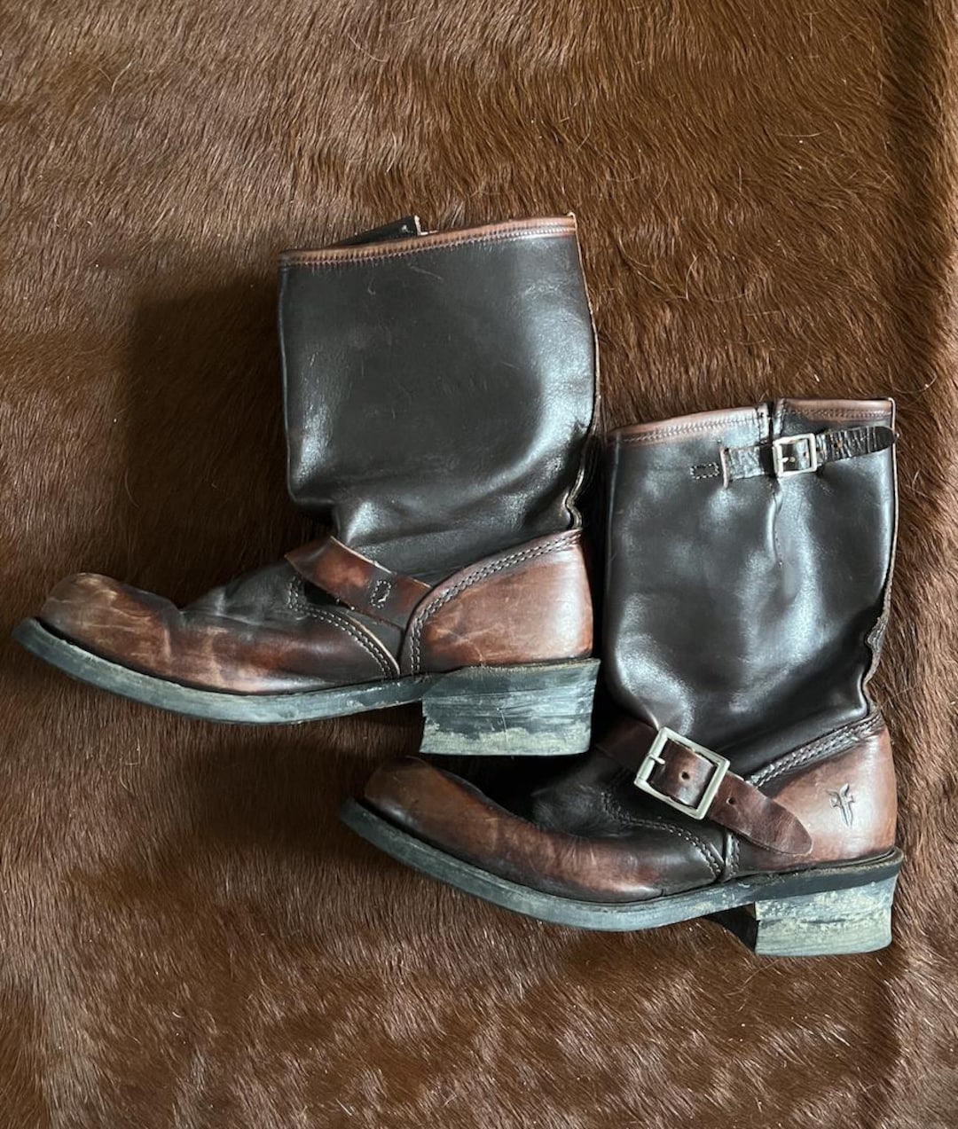 Frye | Shoes | Frye Engineer Boot Distressed Black Tan Leather Moto ...