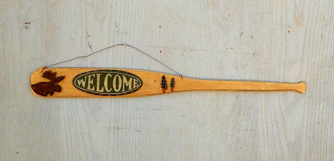 Vintage Distressed Welcome Sign Canoe Paddle Hanging Moose Pine Trees ...