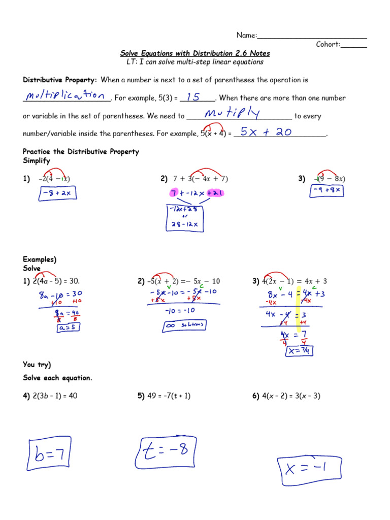 2.5 Solve Equations With Distribution Notes 2021-2022 Key | PDF ...