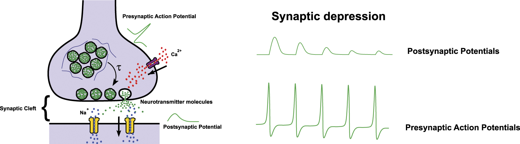 Illustration of a pre-synaptic neuron (green) and a post-synaptic ...
