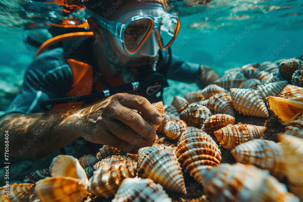 Scuba diver holding seashells while exploring vibrant life under the ...