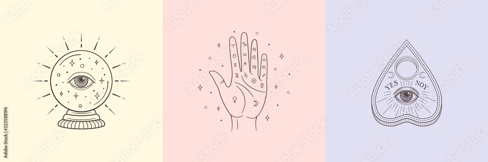 Types of Divination: palmistry, crystal ball, ouija planchette. Witch ...