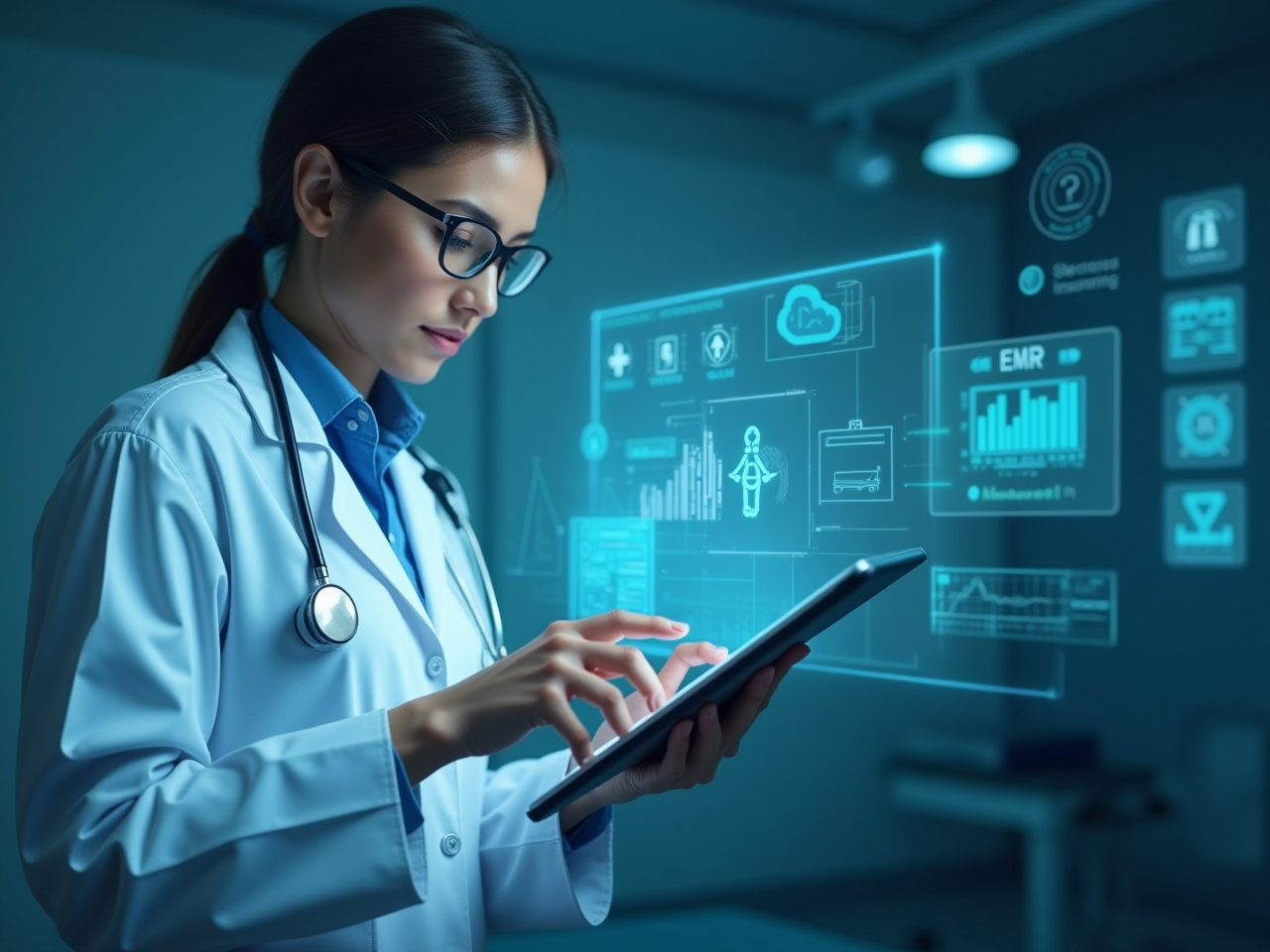 Medical doctor using advance technology big data visual display ...