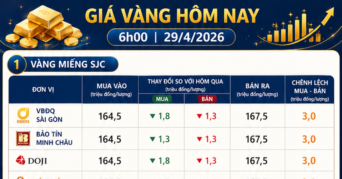 Giá vàng hôm nay 29/4/2026: Bảng giá SJC DOJI PNJ cập nhật sớm nhất