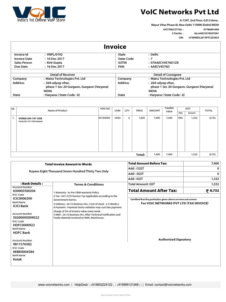 Voic Networks PVT LTD: Invoice | PDF | Value Added Tax | Invoice