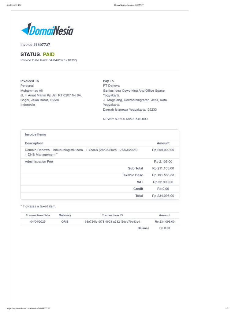 Domain Renewal Invoice for pedex.co.id | PDF