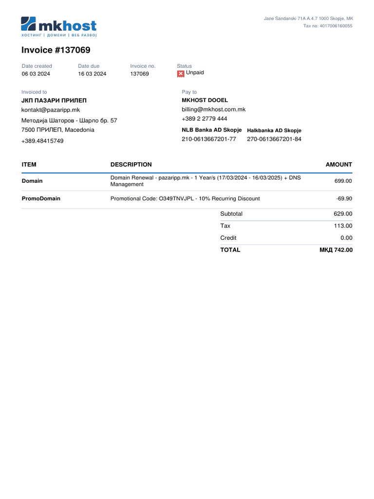 Invoice for Domain Renewal - pazaripp.mk | PDF