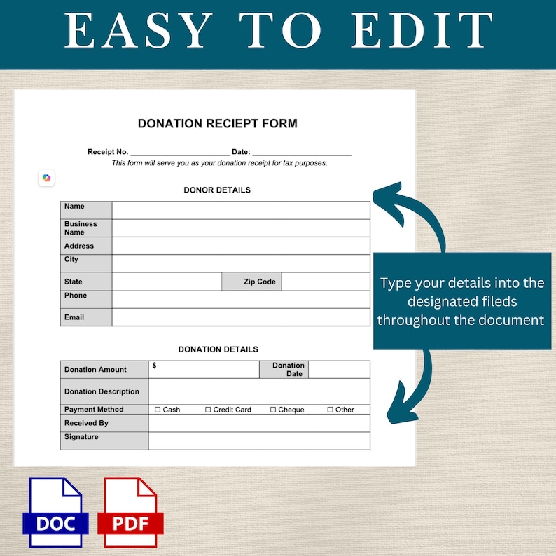 Donation Receipt Form, Editable Template for Donations, Nonprofit ...