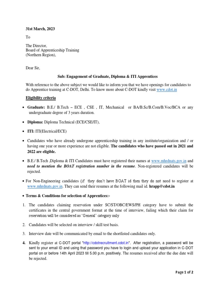 C DOT Grad Diploma ITI Apprenticeship Recruitment 2023 | PDF ...