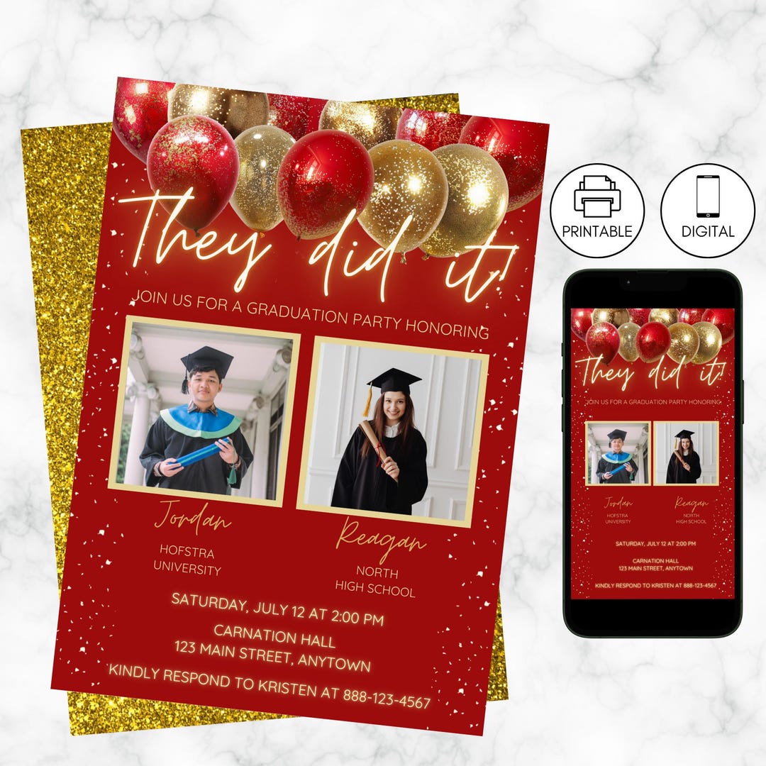 Double Graduation Photo Party Invitation, Editable Template, Red & Gold ...