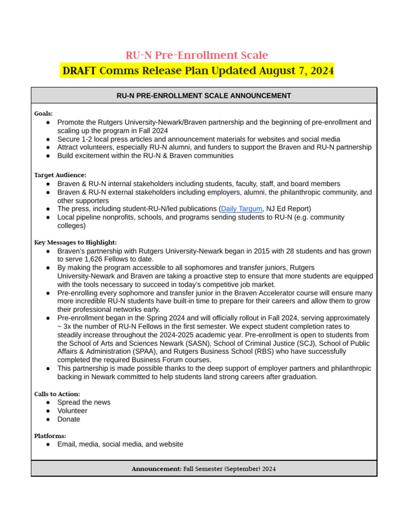 (Working Draft) RUN Pre-Enrollment Scale Comms Plan | PDF