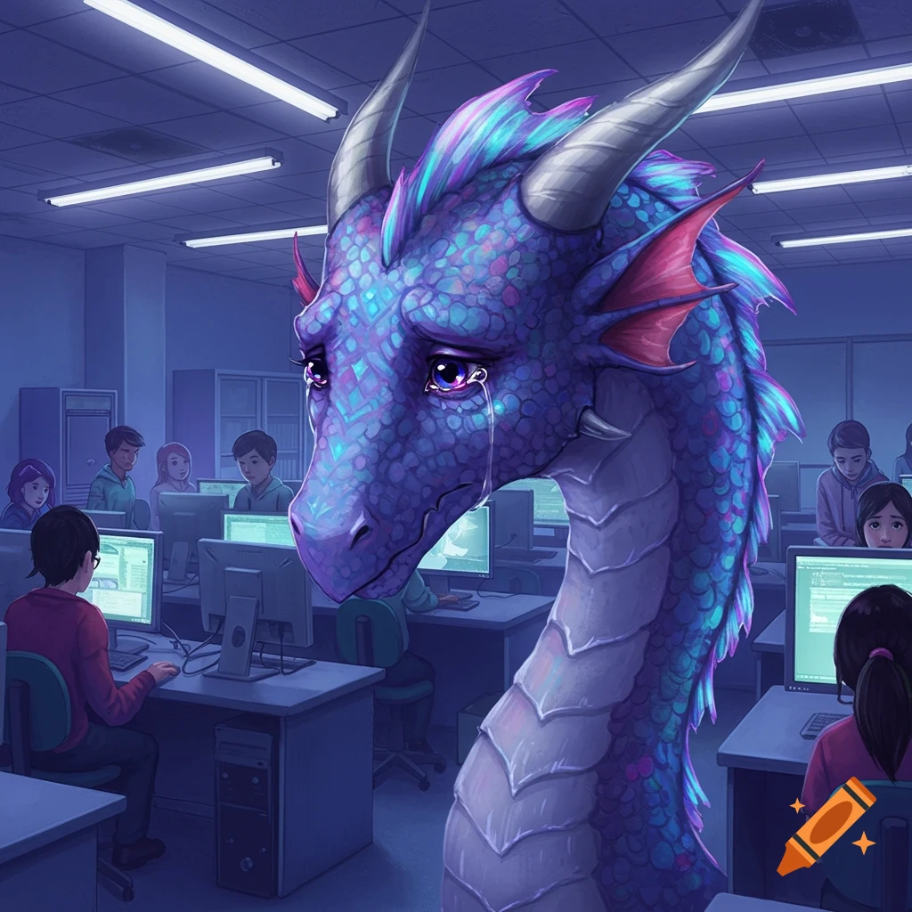 A sad purple dragon cries in a computer lab with students working at ...