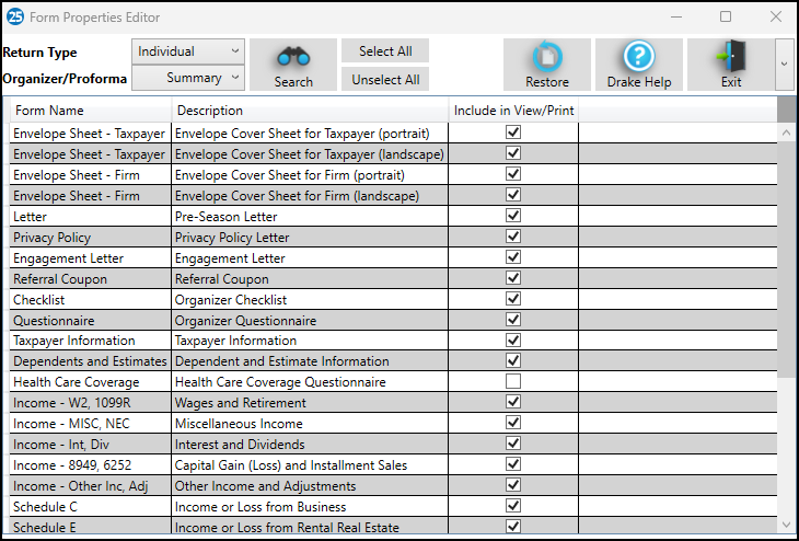 Drake Tax - Organizer and Proforma Form Properties