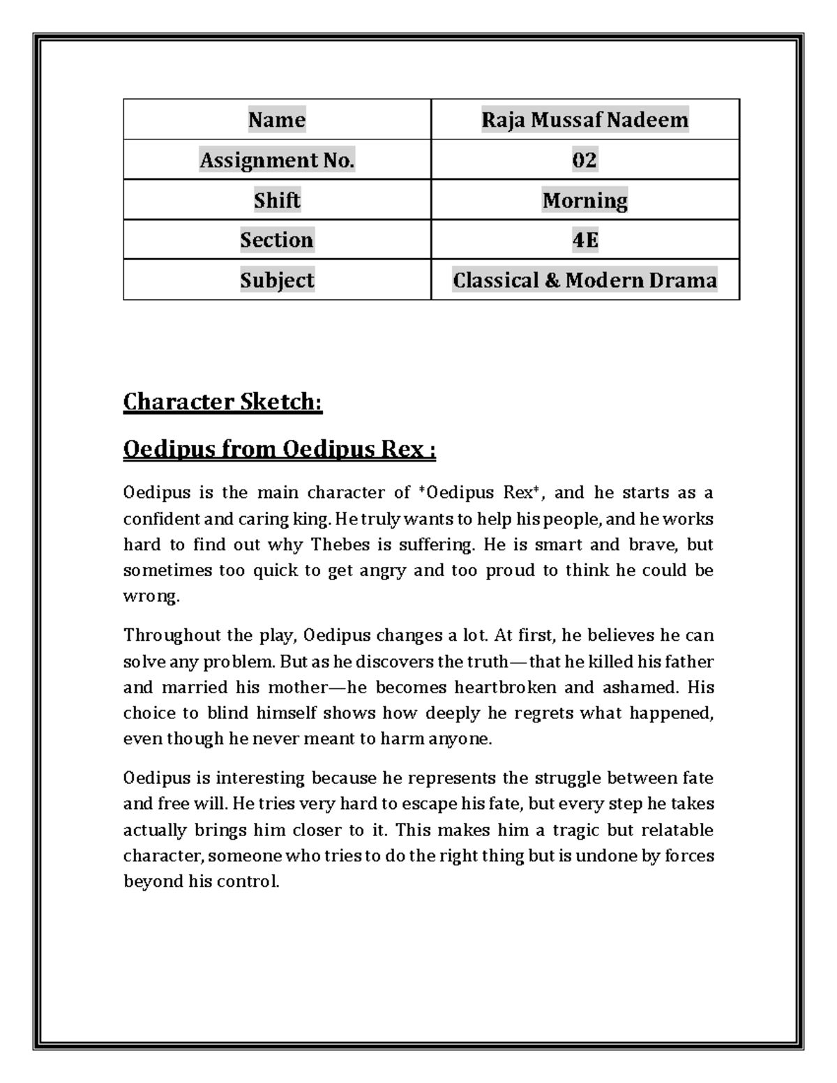 Classical Modern Drama Assignment 02: Character Sketch of Oedipus - Studocu