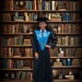Graduate in cap and gown with books in front of a library bookshelf ...